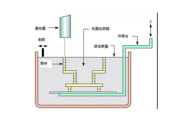 首先,根據(jù)CAD設(shè)計(jì)構(gòu)思三維實(shí)體模型,利用離散程序?qū)?shí)體模型進(jìn)行切片處理,設(shè)計(jì)構(gòu)思照射外形,所形成的數(shù)據(jù)信息將對(duì)光源及升降臺(tái)運(yùn)動(dòng)進(jìn)行精確控制;然后,起吊平臺(tái)的相對(duì)距離下落,光固化層覆蓋另一層液體樹(shù)脂后,再照第二層,將第二層牢固粘結(jié)于上一層固化層,逐層堆疊為三維產(chǎn)品原型。其次,激光器根據(jù)切片形狀釋放相對(duì)形狀的光斑,固化樹(shù)脂后完成片層的生產(chǎn)加工;從樹(shù)脂中取出原型,最后固化,再經(jīng)過(guò)拋光、電鍍、噴漆或著色等工序,得到所需產(chǎn)品。
